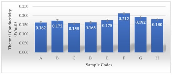 The fibrous materials are made up of trapped air and fibers. Stagnant air refers to the amount of air trapped in the fabric’s interior structure. Because stagnant air has a lower thermal conductivity value than fibers, the amount of stagnant air is an essential element influencing the thermal conductivity value of textile structures [37]. The thermal conductivity of air at room temperature (approximately 20 °C) is around 0.0264 W/m·K [38]. This value is significantly lower than the thermal conductivity values observed in our samples, which range from 0.158 to 0.212 W/m·K. The higher thermal conductivity in our samples is likely due to the solid matrix of the BC films, which facilitates more efficient heat transfer compared to air. Materials like Styrofoam have thermal conductivities around 0.033 W/m·K, which is higher than air but still lower than our samples [39].