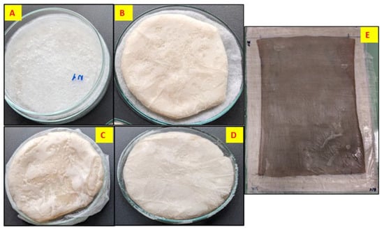 The form stabilization of BC films to enhance properties during lyophilization. According to the sample description in Table 7. (A–E) Conventional pre-freezing samples before lyophilization.