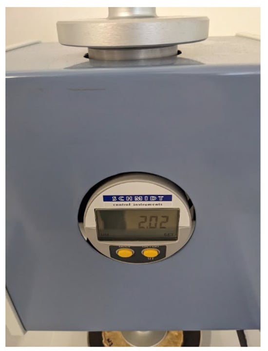 The modulus of elasticity of the BC aerogels under compressive loads was determined by the compression test under various loads. Measurements were taken in accordance with ASTM 1777 Version 2 [42] using a compression test measuring device of the type of Schmidt Control Instrument Thickness Gauge D-2000 (Waldkraiburg, Germany). Thickness measurements were performed at pressures of 1 kPa, 100 g, 200 g, and 500 g. Figure 16 shows the testing machine, which includes a sample and a pressure unit.
