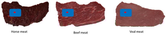 The meat samples examined were horse, beef, and veal meat. Horse meat, being particularly rich in iron, is affected by a rapid change of color. As reported by Tikhonov et al. [24], the darkest color is due to the higher content of myoglobin that, when exposed to air, forms the pigment oxymyoglobin. Data were reported for untreated (TQ) and treated (TR) meat with active gel, and color was detected at times T0, T24, T48, T72, and T96. An area of the image was selected and analyzed through ImageJ 2 to characterize the color (Figure 1).