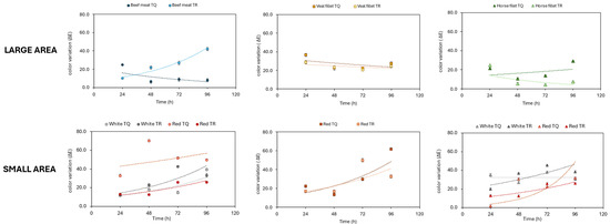 Data collected for all types of meat showed a substantial variability in single RGB coordinates within the “large area”, with differences in the order of magnitude of approximately 100. In contrast, the “small area” demonstrated much closer tolerance among RGB coordinates, with measured minimum and maximum values differing by about 10 points. The average values from both RGB coordinates were used to calculate the color variations (∆E) over time. Figure 2, instead, displays the ∆E trend from 24 h to 96 h for all meats, highlighting how color changes progressed during the storage period.