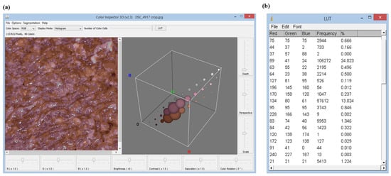 Therefore, Method B can relate RGB coordinates obtained with a frequency (expressed as percentage) (see Figure 3b), indicating the prevalence of each color in the image (Figure 3a). Figure 4, in contrast, presents data obtained using Method B for both untreated (Figure 4a) and treated (Figure 4b) hamburger. This type of approach has the advantage that it is not disturbed by surface inhomogeneity, as occurs with Method A.