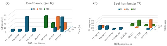 Method B was used to measure the color variation of untreated (TQ) and treated with gel solution (TR) beef hamburgers at times T0, T24 and T48. This method exploits the “Color inspector 3D” tool to obtain information concerning the frequency of each color coordinate extracted from a target area of the picture, as displayed in Figure 3.