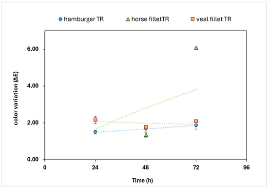 Although the values of the TR meat samples remain lower only at T24, statistical analyses did not confirm significant differences in treatment, and this is probably due to the accelerated formation of meta-myoglobin, compounds related to browning phenomena, typical in horse meat.