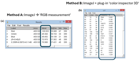 In Method A, the color analysis was carried out using the “RGB Measure” command of the ImageJ software which allows obtaining the colorimetric information in the RGB field of the image under analysis (Figure 6a). The pictures acquired by the camera could be analyzed completely or in a portion of them. The color variations occurring in the considered time intervals were evaluated using the Euclidean distance between each three coordinates (red, green and blue). The evaluation of the colorimetric coordinates was then carried out by analyzing the data in Microsoft Excel.