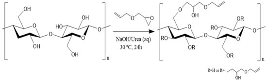 The NaOH/urea/water solvent system limits the cellulose dissolution to a maximum molecular weight of the cellulose chains to less than 105 g/mol, which corresponds to a maximum degree of polymerization (DP) of cellulose of approximately 600 []. Therefore, the DP of cellulose pulp was reduced to about 280 by acid hydrolysis, similar to those achieved by other hydrolysis methods [,]. This reduction in DP enabled the dissolution of cellulose and subsequent homogenous modification reaction. Cellulose can react directly with allyl glycidyl ether (AGE) in a NaOH/urea/water solvent system as the basicity of the solvent is enough to promote etherification []. Cellulose was modified with a ratio of 5:1 of AGE to anhydroglucose unity (AGU), as shown schematically in Figure 1, and the success of modification was evaluated by NMR and FTIR spectroscopies.