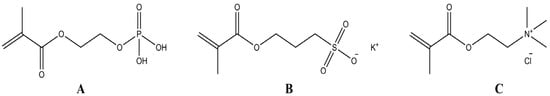 Chemical structure of the monomers used in this work: (A) phosphoric acid 2-hydroxyethyl methacrylate ester (PAHEMA), (B) 3-sulfopropyl methacrylate potassium salt (SPM), and (C) [2-(methacryloyloxy)ethyl] trimethylammonium chloride (METAC).