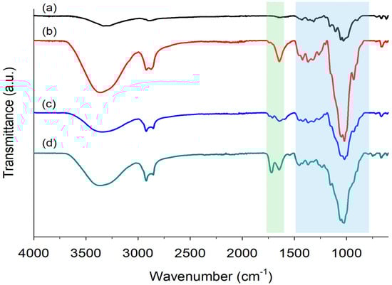 FTIR spectra of dried samples of (a) cellulose powder, (b) AC derivative, and of hydrogels (c) Cel100, and (d) Cel50_P12.5_S25_M12.5.