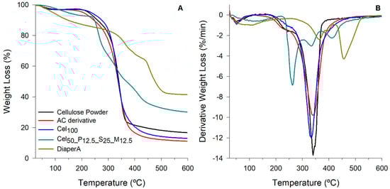 (A) Weight loss curves of cellulose powder, AC derivative, Cel100, P100_c5, M100_c5, Cel50_P12.5_S25_M12.5, and DiaperA; (B) respective derivatives of weight loss with respect to time (dTG).