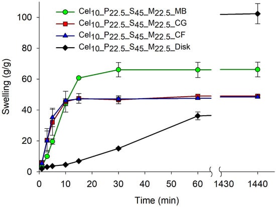 Also, the swelling kinetics of the Cel10_P22.5_S45_M22.5 hydrogel samples subjected to the three different griding processes were analyzed to evaluate how this process affects water absorption (Figure 6). In the initial 10 min, all three methods exhibited fast and comparable swelling kinetics. Subsequently, distinct differences in their performance became apparent. The CF and CG methods showed similar swelling behavior, with equilibrium swelling ratios of about 48 g/g, whereas the MB hydrogel exhibited superior performance, attaining ~67 g/g. However, none of the ground methods approached the maximum value previously obtained (102.3 g/g) with disk samples. Nevertheless, after 15 min, all ground samples reached their maximum swelling capacity, demonstrating rapid swelling kinetics, which were not observed in disk samples (black line). A gap was made in the time axis to a better understanding and larger representation of the initial time points. In Figure 6, the black line refers to the disk sample which showed slower swelling kinetics. While the other ground samples had already reached their maximum swelling after 60 min, and the graph line therefore shows the same value, the disk sample was still increasing its absorbency, resulting in the observed cut in the graph. In PCPs, rapid absorption is crucial to efficiently trapping liquids, preventing leakage and maintaining skin dryness. In this regard, the smaller particles, with a larger surface area-to-volume ratio, facilitated faster water absorption, enabling the material to reach equilibrium quickly. Thus, grinding methods that produce smaller particles proved highly relevant for personal care product applications, but the results also suggest that certain ground methods may compromise the structure of cellulose-based hydrogels, significantly impacting swelling performance.