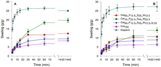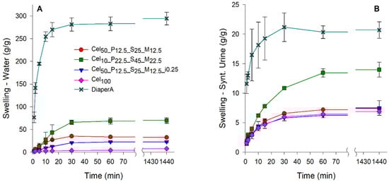 Fluid salinity is one of the factors influencing the swelling capacity of hydrogels. This factor was investigated, as the proposed application requires salt-resistant hydrogels to ensure high swelling in the presence of saline solutions [,]. The swelling kinetics of selected hydrogels are present in deionized water (Figure 7A) and in synthetic urine (Figure 7B). In deionized water, the differences in absorption between the prepared hydrogels and the SAP from diapers were particularly clear. DiaperA SAP showed a significantly higher water absorbing capacity, attaining a maximum absorption of ~295 g/g. Among the prepared hydrogels, the Cel10_P22.5_S45_M22.5 formulation proved to be the most remarkable, as it achieved a swelling ratio of 69 g/g. The remaining hydrogels exhibited significantly lower swelling capacities, ranging from 5 to 10 g/g, which was particularly unexpected, particularly for the Cel50_P12.5_S25_M12.5_i0.25 formulation which had previously achieved a swelling capacity of ~93 g/g in disk samples. This result is possibly due to the lack of a compact structure and low gel content, resulting in a significant reduction in swelling after grinding. Despite the higher swelling capacity of DiaperA in water, the introduction of salinity into the medium led to a drastic decrease in its maximum swelling capacity. Although the highest swelling capacity of DiaperA was maintained in synthetic urine, the ability of hydrogels to absorb liquid solution was significantly reduced by the presence of salts, resulting in a decrease in the maximum swelling from ~295 g/g to ~20 g/g. Regarding the prepared cellulose-based samples, Cel10_P22.5_S45_M22.5 showed the highest swelling capacity (~15 g/g), which narrowed the gap to DiaperA, compared to the results obtained in water. The other cellulose-based hydrogel formulations had maximum swelling values between 6.9 and 7.5 g/g and showed no substantial difference between water and synthetic urine.