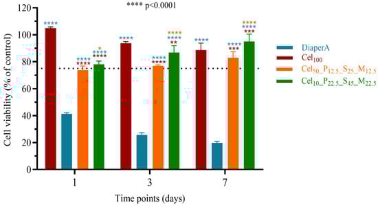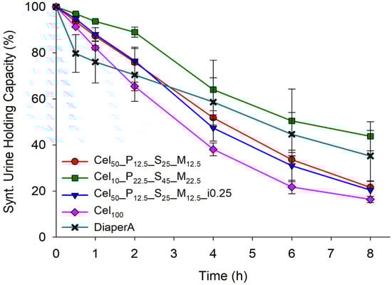 In addition to the requirements for rapid and high liquid absorption for PCPs, SAPs should also have excellent liquid retention, a property not often evaluated by evaporation. The presence of salts in solutions can interfere with the ability of polymers to absorb and retain liquids. The retention capacity of synthetic urine was evaluated over a period of 8 h (Figure 9). DiaperA showed a significant decrease in retention to 70% within the first 2 h, while the prepared cellulose-hydrogels showed greater capacity in retaining synthetic urine. Comparing all the samples, DiaperA showed higher retention of synthetic urine than most cellulose hydrogels, but less than the Cel10_P22.5_S45_M22.5 hydrogel. In the full-time experiment, Cel10_P22.5_S45_M22.5 showed the highest performance by retaining about 44% after 8 h, while DiaperA retained only 35%, indicating its potential for applications requiring higher liquid retention in PCPs.