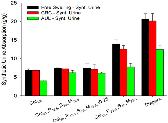 The CRC method was used to determine the retention of synthetic urine in hydrogels after swelling and centrifugation under standardized conditions (Figure 10). In previous studies, it was found that water in a hydrogel can be divided into three types: bound water, half-bound water, and free water.