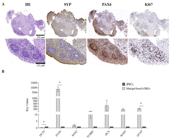 (A) Matrigel®-embedded cORGs microscopic analysis: Hematoxylin and Eosin (H&E), synaptophysin (SYP), paired box 6 (PAX6), and Ki67. Top: magnification 14×, scale bar 200 µm; center: magnification 45×, scale bar 125 µm. (B) Quantitative PCR assay for OCT4, PAX6, SOX2, TUBB3, DCX, MAP2, and GFAP expression in Matrigel®-embedded cORGs at day 40. Data were normalized on βACTIN and HSP90AB1, and calculated for the parental iPSC line. The bars represent the mean ± standard deviation (n = 3: BJ hiPSC line n = 2 and episomal hiPSC line n = 1). Student’s t-test, * p < 0.05.
