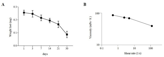 (A) Degradation tests performed on SA-CMC-Matrigel® hydrogel. (B) Viscosity tests performed on SA-CMC-Matrigel® hydrogel, expressed as shear rate function.