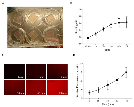 Figure 4A shows the printed samples, indicating that the uniformity and stability of the process sufficed for the obtainment of repeatable 3D-printed structures, which consist of 50 × 200 × 200 mm grids. A swelling test evaluated the ability of the SA-CMC-Matrigel® hydrogel-based ink to incorporate water. The hydrogel absorbs liquids with gradually rising kinetics that tend to plateau after 24 h, and it is prone to swelling, ultimately doubling its initial weight, as seen in Figure 4B. Last but not least, a diffusion test using fluorochrome-conjugated bovine serum albumin on the SA-CMC-Matrigel® hydrogel-based ink was evaluated to determine the hydrogels’ ability to permit the interchange of proteins, growth factors, and metabolites. Albumin, a key plasma protein, is often used as a model macromolecule in these tests due to its biological relevance and ability to mimic the behavior of larger molecules or drugs. Diffusion tests on hydrogels are important for evaluating the hydrogel’s potential for biomedical applications, particularly in drug delivery systems, but also in vitro modeling to ensure the correct delivery of the induction factors. Fluorescent microscopy data (Figure 4C,D) confirmed an exponential increase in fluorescence intensity over time, with a 10-fold increase at 180 min compared to t0, confirming the hydrogel’s capacity to release or interact with proteins and other biomolecules.