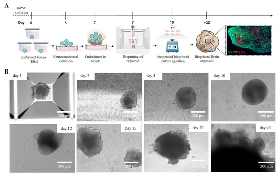 (A) Schematic workflow of the 3D-bioprinted hydrogel-based cORGs. (B) Representative images of the main steps of iPSC-derived cORG formation.