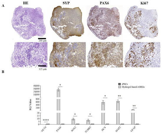 After 4 weeks of maturation, the manually Matrigel®-embedded cORGs were analyzed in terms of neuro-marker expression by immunohistochemistry (IHC) and quantitative PCR (qPCR). To evaluate the neuronal induction efficiency, maturation degree, regionalization, and cellular heterogeneity of the cORGs obtained, the main identifying markers of macro-areas of the brain in development were selected. IHC confirmed not only the expression of the expected markers, but also their localization and compartmentalization (Figure 2A). Hematoxylin/Eosin staining (HE) revealed two different regions: a parenchyma area with lower cell density and scattered nuclei immersed in the extracellular matrix, and a central region with neural rosettes with higher cell density and radially arranged nuclei around a central lumen. Specifically, the presence of rosette-like structures composed of proliferative neural stem cells (PAX6+/Ki67+) organized into polarized tube-like structures surrounded by post-mitotic cortical neurons (SYP+) was confirmed.
