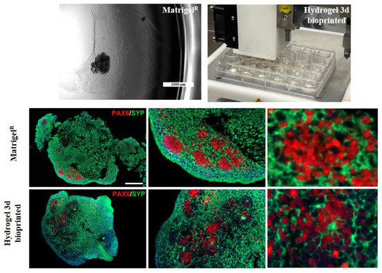 Representative images for Matrigel®-based and 3D-bioprinted cORGs and immunofluorescence assay: double staining of synaptophysin (SYP) in green, and paired box 6 (PAX6) in red. Nuclei are stained with DAPI in blue. LEFT: magnification 18×, scale bar 200 µm; center: magnification 45×, scale bar 125 µm; right: magnification 150×, scale bar 40 µm.
