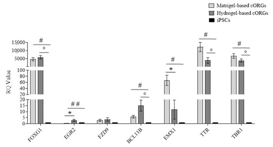 Quantitative PCR assay for FOXG1, EGR2, FZD9, BCL11B, EMX1, TTR, and TBR1 expression in Matrigel®-based and 3D-bioprinted cORGs at day 40. Data were normalized on βACTIN and HSP90AB1 and calculated for the parental iPSC line (black bars). The bars represent the mean ± standard deviation (n = 3: BJ hiPSC line n = 2 and episomal hiPSC line n = 1). Statistical analysis was performed using Student’s t-test. * Matrigel®-based cORGs vs. hydrogel-based cORGs, # * Matrigel®-based cORGs vs. iPSCs, ° hydrogel-based cORGs vs. iPSCs. *, #, and ° p < 0.05, ## p < 0.01.