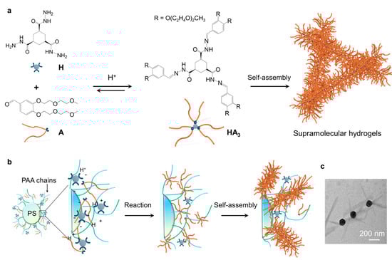 In recent years, we and the van Esch group have systematically studied a hydrazone-based supramolecular hydrogelation system, where the gelator HA3 is formed from the precursors hydrazide H and aldehyde A through the formation of hydrazone bonds (Figure 1a) []. By using catalysts, like acids or aniline, the formation and self-assembly of HA3 can be dramatically accelerated. Here, we demonstrate a polymer brush-mediated strategy to achieve spatial control over the self-assembly of HA3 at nanoparticle surfaces. Our system employs polyacrylic acid (PAA)-grafted polystyrene nanoparticles to create confined proton-rich microdomains that precisely localize both formation and self-assembly of HA3 within nanometers of the particle surface (Figure 1b). The effects of different parameters of the nanoparticles, including the concentrations and brush length of the nanoparticles on the hydrogel formation and the properties of the resultant hydrogels were studied. Our results demonstrate that the concentration relative to brush length of the nanoparticles has a greater effect on the formation and the material properties of the hydrogels, such as gelation time, mechanical stiffness, and network structure. Importantly, the hydrogel fibers were found to be specifically formed around the nanoparticles, demonstrating the access to directed nanoscale molecular self-assembly (Figure 1c).