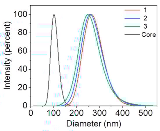 In this study, nanoparticles with different brush lengths (156, 168, and 175 nm, respectively) were prepared by initiating the growth of polyacrylic acid (PAA) chains from the surface of polystyrene nanoparticles via surface-initiated photoemission polymerization []. Particle size distribution and zeta potential were measured using the dynamic light scattering (DLS) technique. The results show that the diameter of the core polystyrene nanoparticles is 96 ± 6 nm. In contrast, the overall diameters with polyacrylic acid brushes were measured with dimensions of 252 nm, 264 nm, and 271 nm, variations attributed to differing reaction times. Zeta potential assessments indicated that these nanoparticles possess a negatively charged surface, with potentials recorded at −7.5, −8.4, and −12.3 mV, respectively, as shown in Figure 2 and Table 1.