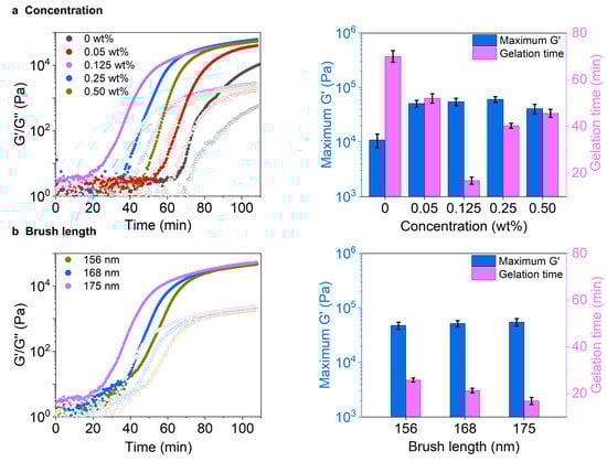 Rheological tests on the hydrogel formation in the presence of different nanoparticles. Effects of (a) nanoparticle concentration and (b) brush length on the hydrogelation process and the stiffness of the resultant hydrogels. All the samples: [H] = 20 mM, [A] = 80, at pH 7.0.