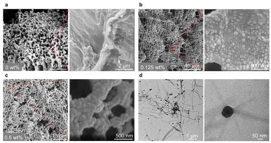 SEM pictures showing the hydrogel network morphology formed in the presence of different nanoparticle concentrations, (a–c) is 0, 0.125, and 0.5 wt%, respectively, insets are the magnified images. Samples: [H] = 20 mM, [A] = 80 at pH 7.0; and (d) TEM pictures demonstrating the localized formation of the hydrogel fibers in the vicinity of the nanoparticles. The sample: [H] = 5 mM, [A] = 20 at pH 7.0.