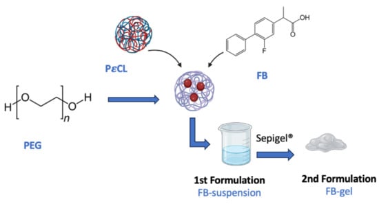 Flurbiprofen, poly(ε-caprolactone) (Mw ≈ 14,000 g/mol, Mn ≈ 10,000 g/mol, dispersity = 1.4), PEG-3350, and acetone were obtained from Sigma-Aldrich Co. (St. Louis, MO, USA). Poloxamer 188 (P188; Lutrol® F68) was sourced from BASF (Barcelona, Spain), while Sepigel® 305 (polyacrylamide, C13-14 isoparaffin, laureth-7) was procured from Acofarma (Barcelona, Spain). Phosphate-buffered saline (PBS) tablets were purchased from Sigma-Aldrich Chemie (Steinheim, Germany) and prepared per manufacturer’s instructions. Double-distilled water was filtered using a Millipore® system (EMD Millipore, Billerica, MA, USA). High-performance liquid chromatography (HPLC) reagents were obtained from Fisher Scientific (Leicestershire, UK).