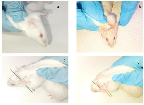 This study analyzes and compares the efficacy of two formulations characterized by El Bejjaji et al. [] and Ramos et al. [,], designed for both preventing and treating inflammation associated with skin perforation procedures, such as ear tagging, piercings, or microdermal implants. To optimize their effectiveness and ensure user comfort, the formulations were administered 30 min before the procedure. This carefully planned timeframe was an essential component of the experimental design, allowing for thoroughly evaluating their anti-inflammatory properties in both preventative and therapeutic contexts.