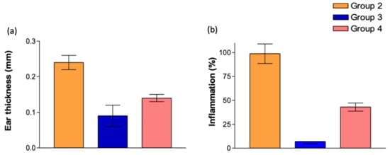 Graphical representations of (a) ear thickness and (b) percentage of inflammation.