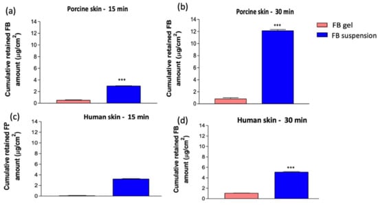 The amount of FB retained in porcine skin (a,b) and in human skin (c,d) at 15 and 30 min; ***: p < 0.0001.