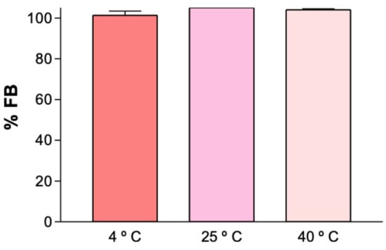 The stability results of the suspensions were published by Ramos et al. [,]. Chemical stability studies on the gels were conducted by quantifying the drug content at different temperatures using HPLC analysis to determine the optimal storage temperature range for the formulation. A sample of FB-gel, prepared at room temperature (25 °C), was stored for three months at three different temperatures: 4 °C (refrigerated), 25 °C (ambient), and 40 °C (incubator). At the end of this period, the FB content was assessed using HPLC analysis. The results indicate no decrease in concentration over time, with no statistically significant differences observed in the obtained values (Figure 7).