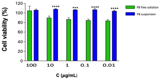 Assessing cell viability is essential for ensuring the safety of the developed formulation and to prevent potential cytotoxic effects that could disrupt skin barriers and compromise the body’s primary protective layer. As shown in Figure 8, the FB-solution does not affect cell viability after 24 h of exposure at any of the tested concentrations. The two formulations shown in Figure 8 exhibit cell viability above 80%, indicating that free FB is not considered cytotoxic. However, the statistically significant differences observed between free FB and FB incorporated into nanoparticles suggest that nanoparticles can reduce cytotoxicity. Therefore, this approach represents a safe and effective drug delivery system. Nanoparticles play a crucial role in reducing drug toxicity by enhancing targeted delivery, controlling release, and improving bioavailability. Encapsulating drugs in nanoparticles minimizes their exposure to healthy tissues, reducing systemic toxicity and side effects. Polymer-based nanoparticles, such as poly(ε-caprolactone), provide sustained drug delivery, decreasing toxicity peaks [].