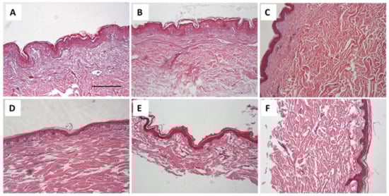 Histological images (Figure 10) provide a comparative analysis of human (A, B, C) and porcine (D, E, F) skin following treatment with different formulations. Control samples (A, D), treated only with saline solution (SF), exhibit a well-preserved epidermal and dermal structure, serving as a baseline for comparison. In the gel-treated samples (B, E), the stratum corneum in the human skin (B) appears structurally similar to the control (A), whereas porcine skin I shows signs of epidermal dehydration. Conversely, in the suspension-treated samples (C, F), human skin (C) exhibits more pronounced dehydration compared to its control, while porcine skin (F) maintains better hydration relative to the gel-treated group.