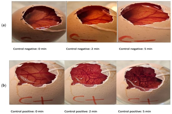 where H stands for hemorrhage; L stands for vessel lysis; C stands for coagulation; and time (s) stands for the number of seconds after which each reaction was observed. A total of 300 μL of the test substance was applied to the CAM, and the membrane was observed for 2 and 5 min to assess the severity of each reaction in accordance with the INVITTOX protocol [,]. NaOH (0.1 N) was used as the positive control, while a 0.9% NaCl solution served as the negative control. The interpretation of the results from Equation (4) can be derived from Table 7.