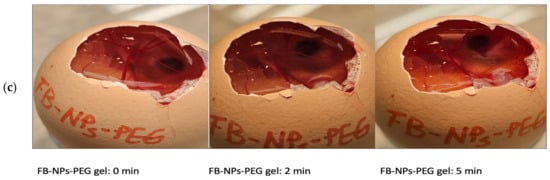An assessment of the irritant potential of the formulations using the HET-CAM method: (a) negative control (saline solution); (b) positive control (sodium hydroxide solution 0.1 N; (c) FB-gel (study formulation).