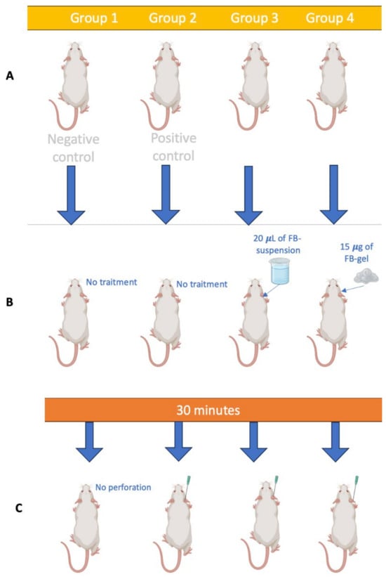 To verify that the formulations under study have a preventive effect on reducing inflammation resulting from a perforation process, an in vivo study was conducted, with four groups of mice (n = 6) being evaluated in parallel (Figure 3).
