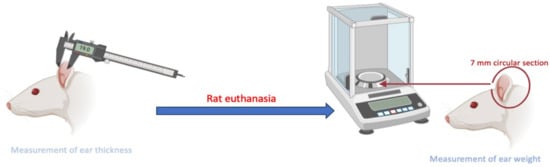 Pain and inflammation are among the most common disorders in contemporary clinical medicine, often occurring in processes where piercings are applied []. To prevent these inflammatory processes when performing skin piercings, two formulas have been used: a suspension and a gel loaded with flurbiprofen nanoparticles. These formulas were applied in mouse models, specifically in the ears, after piercing with a sterile pin to demonstrate their anti-inflammatory capacities.