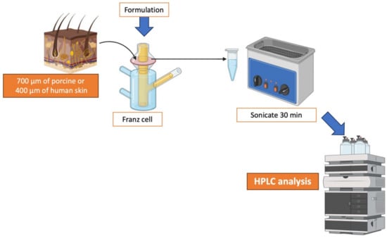 The porcine and human skin tissues were carefully removed from the Franz cell to determine the retained drug concentration. The skin surface was washed three times with gauze soaked in a 0.05% solution of sodium lauryl sulfate and distilled water. Excess skin surrounding the diffusion area was trimmed, and the exposed surface was gently blotted with filter paper to ensure that it was dry before weighing. The retained FB was extracted using an acetonitrile/water solution (50:50, v:v) via sonication for 15 min in an ultrasound bath. The resulting solutions were analyzed via RP-HPLC to determine the amount of FB retained in the skin, expressed as Qr (μg/cm2). The results were normalized based on the tissue weight and the diffusion area (0.64 cm2) and then multiplied by the drug recovery factor. The retained amount of drug in the tissue (Qr, μg/cm2) was determined using the following equation: