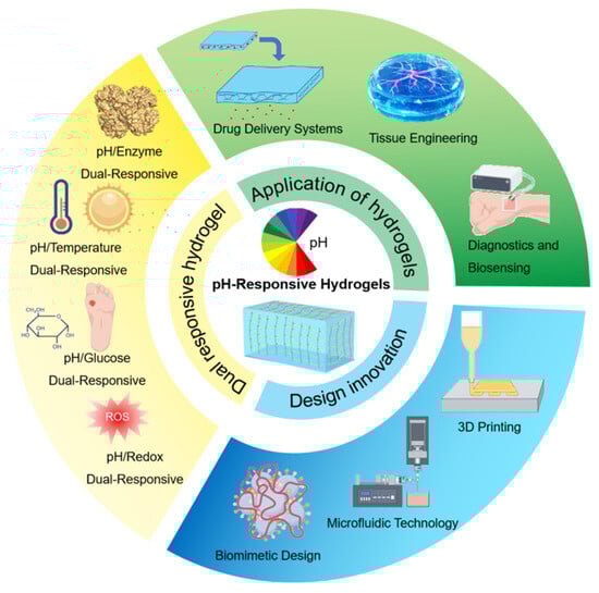 As an intelligent polymer material, pH-sensitive hydrogels exhibit the capability to dynamically sense alterations in ambient pH levels and subsequently initiate corresponding physical or chemical responses, including swelling, contraction, degradation, or ion exchange. Given the significant pH variations inherent in human pathophysiological microenvironments, particularly in tumor tissues, inflammatory lesions, and the gastrointestinal system, these smart materials demonstrate remarkable application potential across diverse domains such as targeted drug delivery systems, regenerative medicine engineering, biosensing, and disease diagnostics. Recent breakthroughs in nanotechnology and precision medicine have substantially propelled advancements in the design and application of pH-responsive hydrogels. This review systematically elaborates on the current research progress and future challenges regarding pH-responsive hydrogels in biomedical applications, with particular emphasis on their stimulus–response mechanisms, fabrication methodologies, multifunctional integration strategies, and application scenarios.