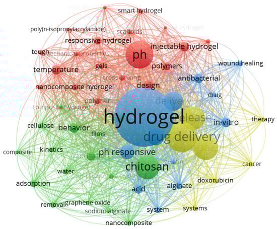 Meanwhile, VOSViewer software was utilized to conduct a co-occurrence analysis of keywords from the previously mentioned 1948 articles to better understand how various keywords are interconnected. The type of analysis selected was Co-occurrence; the unit of analysis was All keywords; and the counting method was Full counting. Among the 6414 keywords, the top 54 with the highest frequency (with a minimum occurrence rate set at 40 times) were selected. Figure 2 displays the network diagram of all keywords, divided into 4 groups, with different colors representing different nodes. Lines indicate connections, and the thickness of the lines between nodes represents the strength of their relationship. Nodes represent keywords, and the size of the nodes is proportional to their frequency in the literature [35]. Through this visual analysis, it becomes easier to intuitively grasp the relationships between these keywords and their significance within the network. The figure reveals that the four keywords (including hydrogel, pH, drug delivery, and chitosan) have the highest frequency of occurrence in this field. This indicates that research centered on pH-responsive hydrogels typically uses chitosan as a carrier material to explore advancements in the drug delivery domain. Additionally, it is observed that keywords such as sodium alginate, cellulose, injectable gels, cancer, wound healing, and doxorubicin also have high frequencies, following closely behind. This reflects significant information about pH-responsive hydrogels in terms of commonly used materials, functionalities, and applications, as well as the degree of correlation between these keywords.