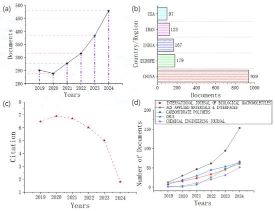 As illustrated in Figure 3a, the annual publication count demonstrated a consistent upward trajectory from 2019 (252 articles) to 2024 (479 articles), indicative of growing academic interest in pH-responsive hydrogels for biomedical applications. Figure 3b presents the geographical distribution of publications, revealing China, Europe, India, Iran, and the United States as the top five contributing nations. Citation analysis (Figure 3c) demonstrated sustained high citation rates from 2019 (6.49 citations/year) to 2022 (6.03 citations/year), with subsequent declines in 2023 (5.01) and 2024 (1.80) attributable to the recency of publications during these periods. Figure 3d shows the top five journals with the highest number of publications in recent years. These journals are the International Journal of Biological Macromolecules, ACS Applied Materials & Interfaces, Carbohydrate Polymers, Gels, and Chemical Engineering Journal. The data indicate that the number of publications in these journals is increasing at a relatively fast pace.