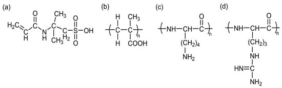 Chemical structures of pH-sensitive polymers: (a) 2-acrylmido-2-methylpropylsulfonic acid; (b) poly(methacrylic acid); (c) poly (L-lysine); (d) poly (arginine).