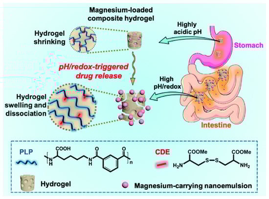 - Huang, Y.; Wang, Z.; Zhang, G.; Ren, J.; Yu, L.; Liu, X.; Yang, Y.; Ravindran, A.; Wong, C.; Chen, R. A pH/redox-dual responsive, nanoemulsion-embedded hydrogel for efficient oral delivery and controlled intestinal release of magnesium ions. J. Mater. Chem. B 2021, 9, 1888–1895. [Google Scholar] [CrossRef]
