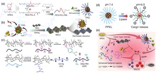 Schematic illustration of the preparation and application of pH/enzyme dual-responsive hydrogel. (a) Synthesis of Lox- loaded PPE micelle (PPEL). (b) Synthesis of MSCO nanozyme. (c) Synthesis of ODex-PBA (ODP) and CS-Arg (CA). (d) Mechanism of pH/lipase-responsive ‘cargo’ release of PPEL micelle. (e) The antibacterial mechanism of hydrogels in infected wounds [68]. Copyright Yang YT et al. National Science Review.