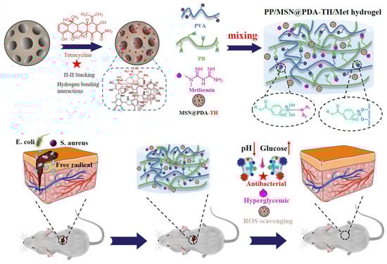 Diabetic complications can lead to foot ulcers [69]. To alleviate the suffering of diabetic patients with foot ulcers, Zhao Let al. [70] prepared a CSPBA/PVA/OHC-PEG-CHO hydrogel. Experimental findings revealed that under conditions of pH 7.4 and in the presence of glucose, the drug release from this hydrogel was significantly better compared to other individual conditions (pH 7.4 or pH 6.5). Zhang Wet al. [71] developed a hybrid diabetic wound dressing system integrating drug-loaded mesoporous silica, injectable polymer hydrogel, and hypoglycemic agent metformin (Met). The system was constructed by first mixing poly(acrylamide-co-dimethylaminopropylacrylamide-co-methacrylamidophenylboronic acid) (abbreviated as PB) with polyvinyl alcohol (PVA) to form an injectable pH/glucose dual-responsive hydrogel (designated as PP) through dynamic phenylboronate–diol bonds between PB and PVA. Meanwhile, polydopamine-modified mesoporous silica nanoparticles (MSN@PDA) were synthesized to load tetracycline hydrochloride (TH), yielding drug-carrying MSN@PDA-TH nanoparticles. The final hybrid hydrogel (abbreviated as PP/MSN@PDA-TH/Met) was obtained by blending PB, PVA, Met, and MSN@PDA-TH. Experimental results demonstrated that phenylboronate ester bond cleavage under acidic conditions (pH = 5.0) triggered partial hydrogel degradation and drug release. Additionally, competitive binding between phenylboronic acid groups and glucose 1,2-diol structures enhanced degradation under hyperglycemic conditions. Animal studies have confirmed the hydrogel’s efficacy in promoting skin ulcer healing in diabetic mice. The fabrication mechanism and experimental workflow are illustrated in Figure 10.
