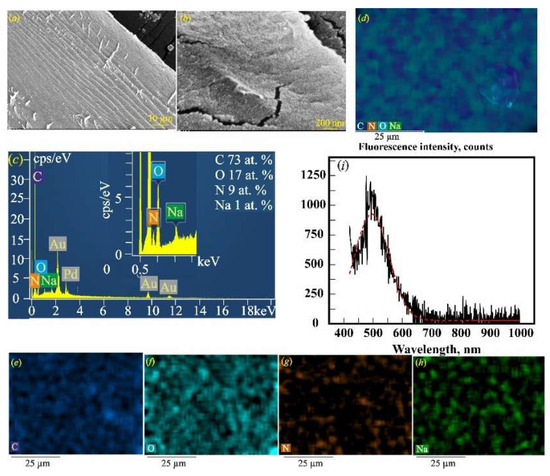 Figure 5e–h show a fairly uniform distribution of C, O, N, and Na throughout the sample. The autofluorescence spectrum of the dried aminocaproic acid-impregnated gelatin–alginate hydrogel Gn_SA_AA in