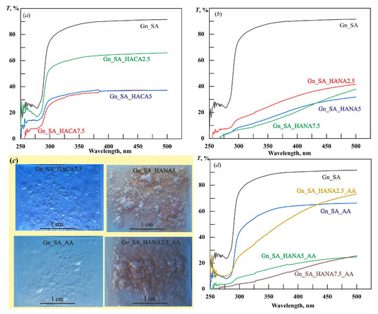 Figure 2d demonstrate a decrease in their transparency for UV–visible light with an increase in HANA content from 2.5 wt.% to 7.5 wt.%, which is in good agreement with the brown color of the films visible in the photograph of the Gn_SA_HANA2.5_AA sample in