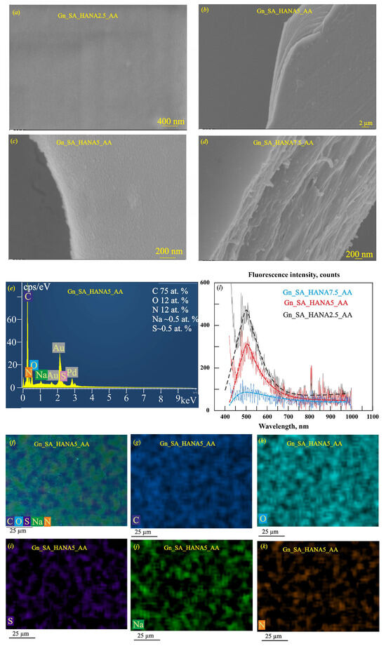 Figure 6a–d show the SEM images of dried gelatin–alginate hydrogels loaded with the hemostatic drug aminocaproic acid and modified with HANA humic acids. They exhibit smooth and even surfaces, layered cross-sections, and the anisotropic morphology of dried Gn_SA_HANA2.5-AA, Gn_SA_HANA5_AA, and Gn_SA_HANA7.5_AA hydrogels, whose ~2 μm thick layers were exfoliated during SEM and EDS observations. Since all these systems had a layered and homogeneous morphology, this indicated a well-dispersed AA filler due to the high solubility of aminocaproic acid in the corresponding sols. Comparison of data [